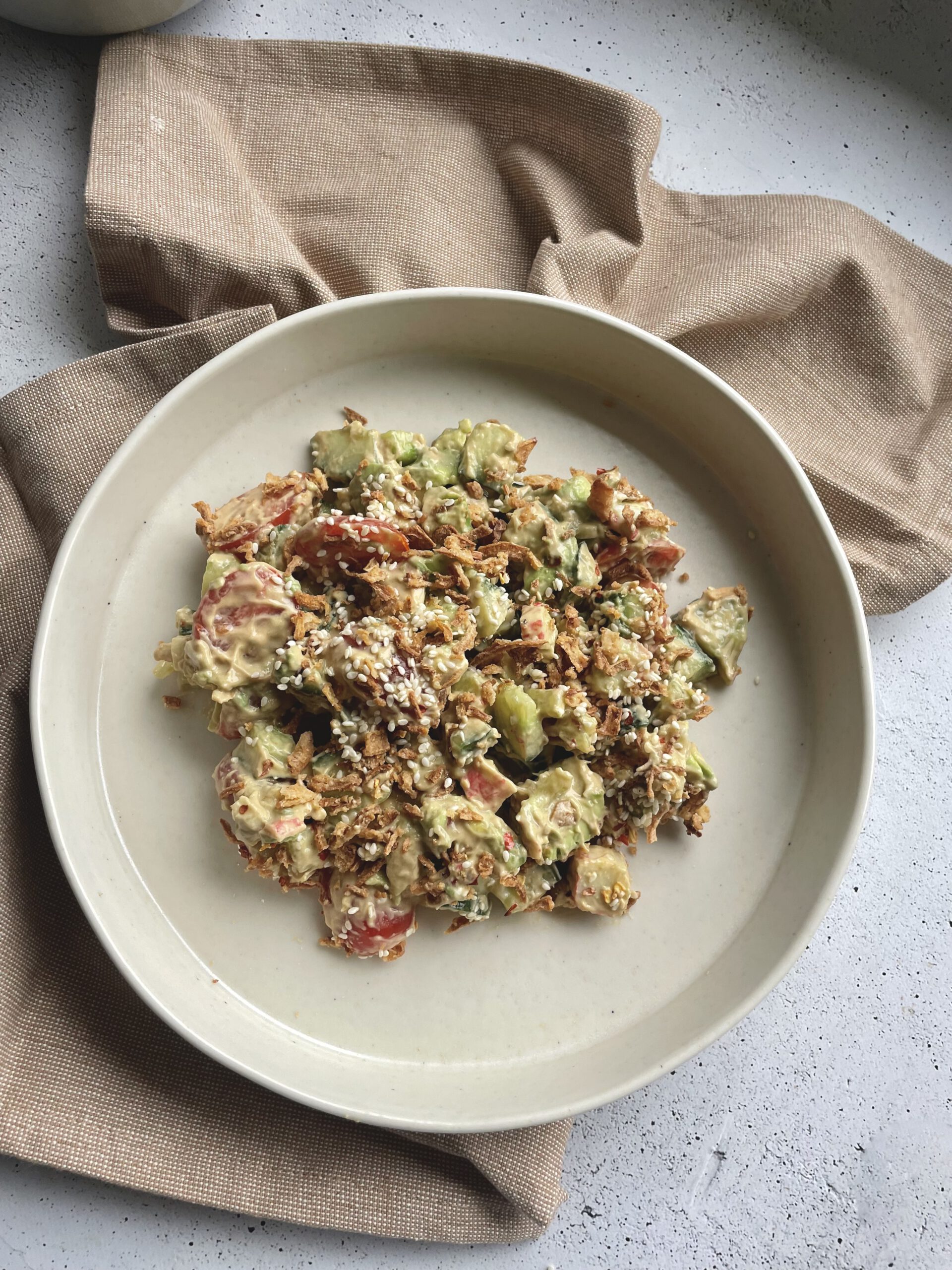 - Snijd de komkommers, avocado, surimi en kerstomaatjes en meng ze in een grote kom.
