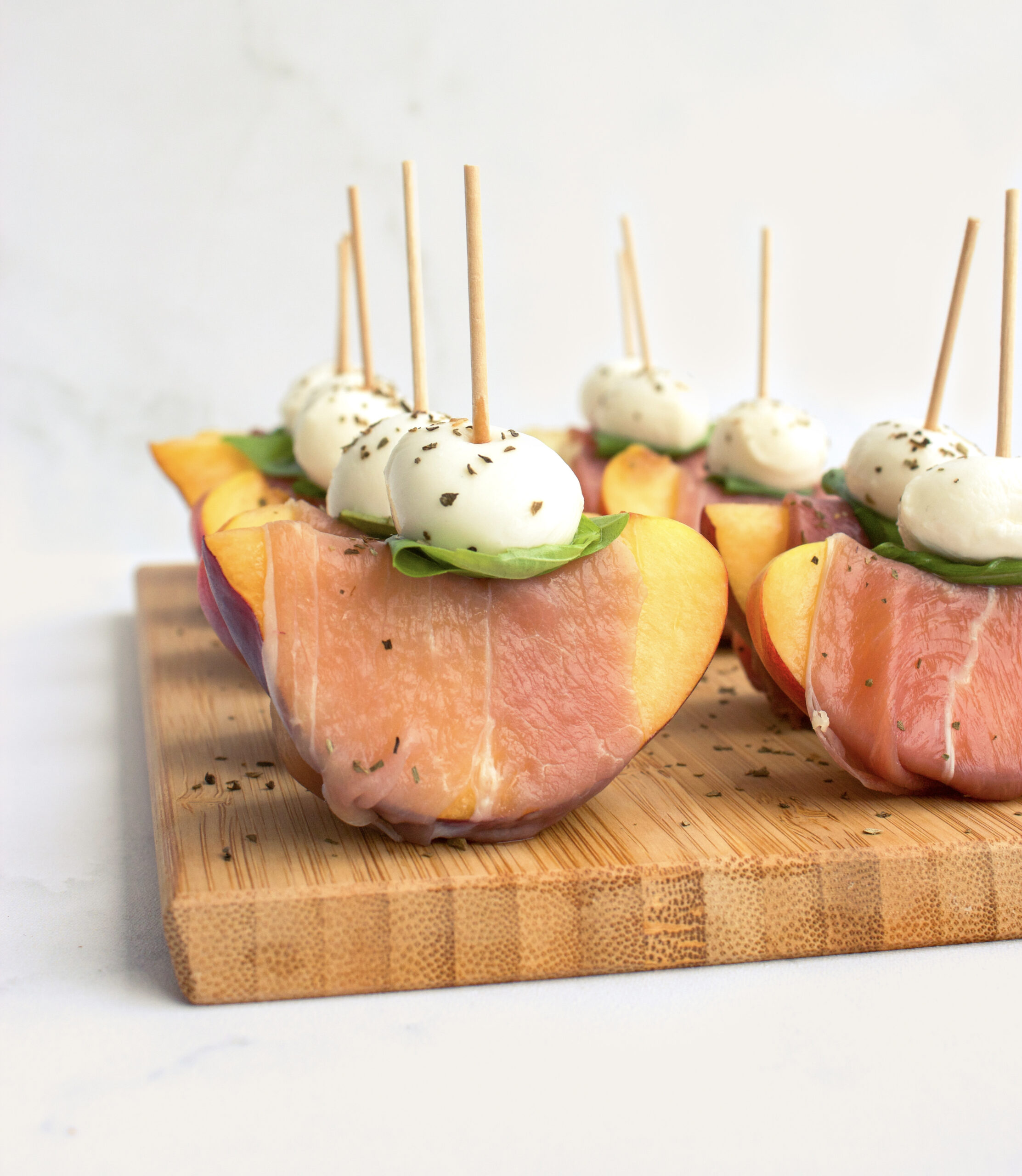 Neem een basilicumblaadje en een bolletje mozzarella op een stokje en prik het in de perzik.