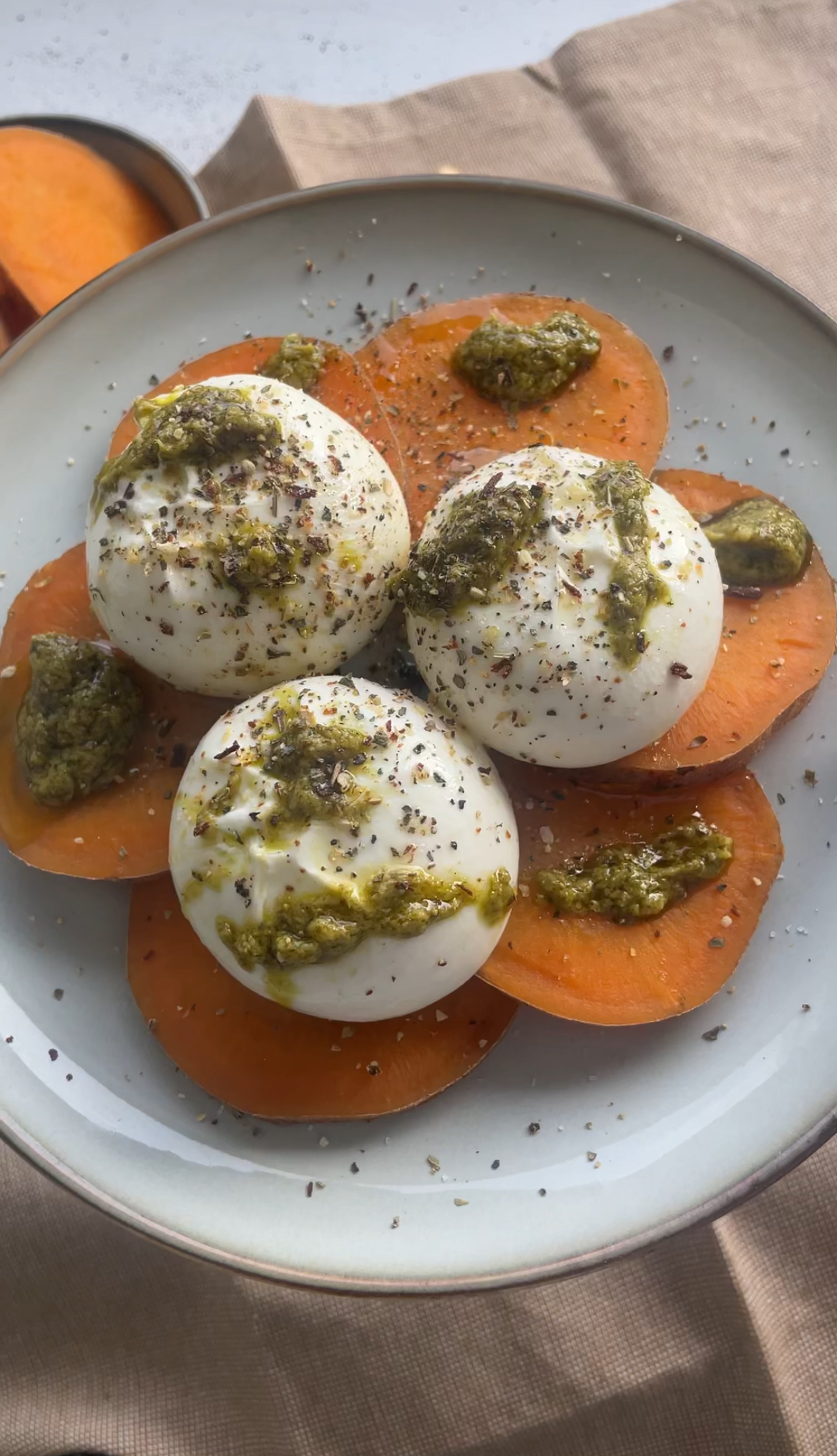 - Plaats de mini burrata bolletjes bovenop de schijfjes.