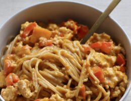 Deze romige pastaschotel zit vol smaak en groenten. De geroosterde butternut en paprika zorgen voor een heerlijke zoete, zachte saus die perfect combineert met kippengehakt en volkoren pasta.