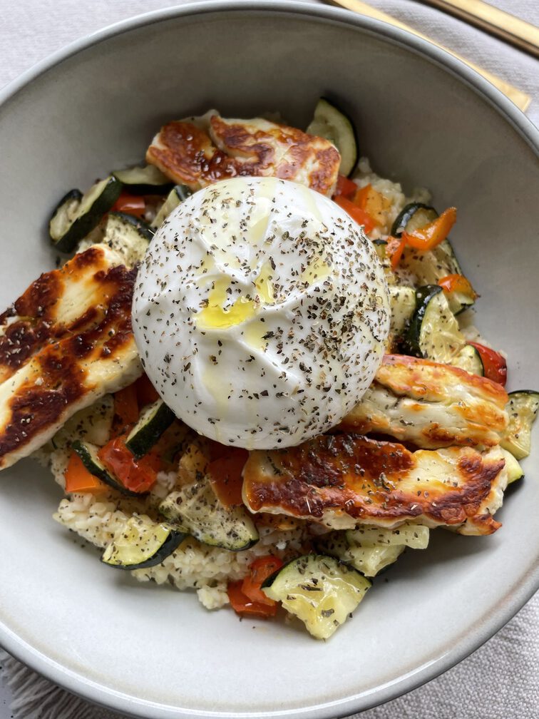 - Meng de bulgur met de geroosterde groenten, halloumi en verse kruiden.
