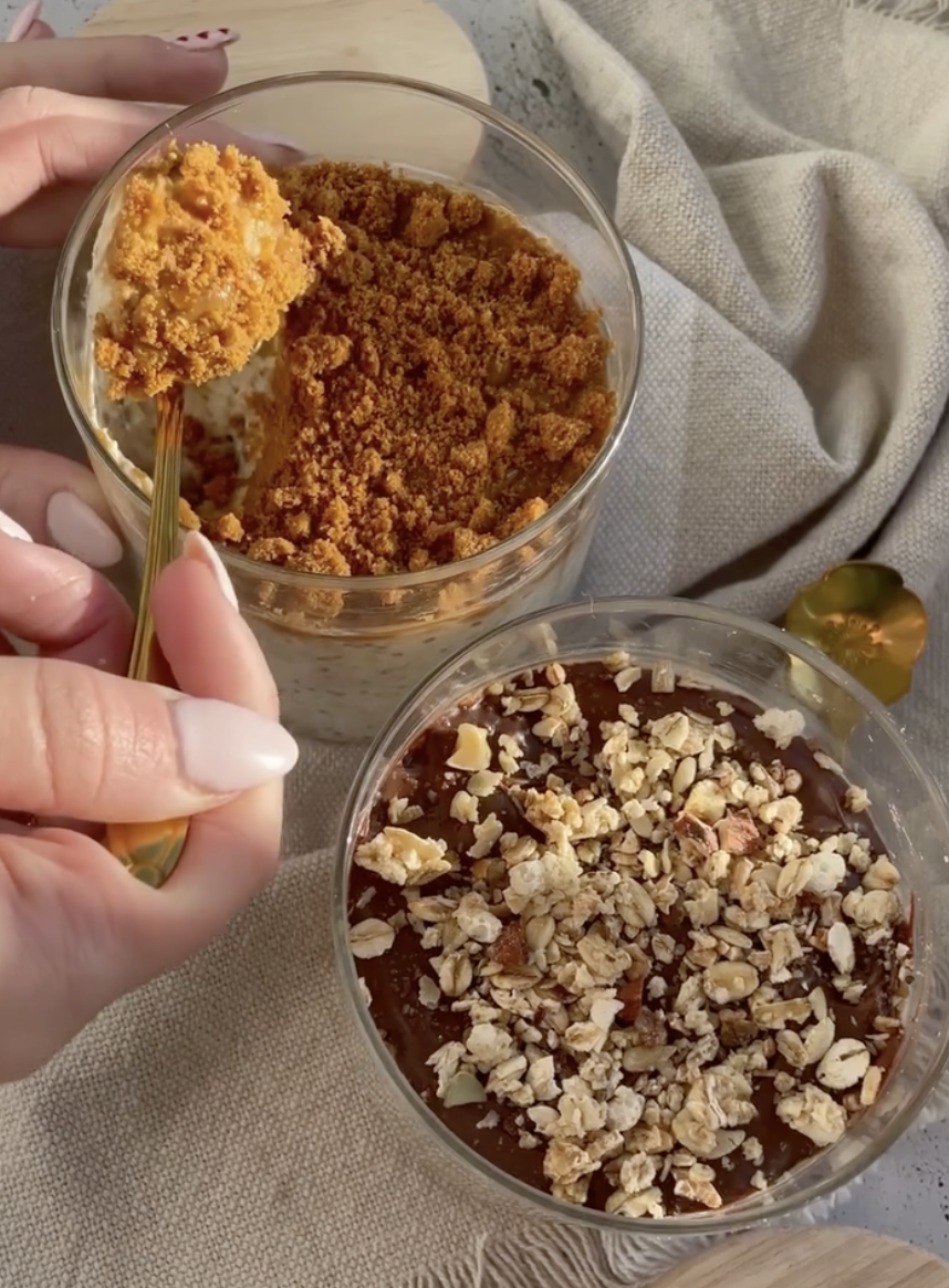 - Schenk de gesmolten speculoospasta of choco over de oats. Bestrooi met de verkruimelde speculooskoek of de Holie muesli.